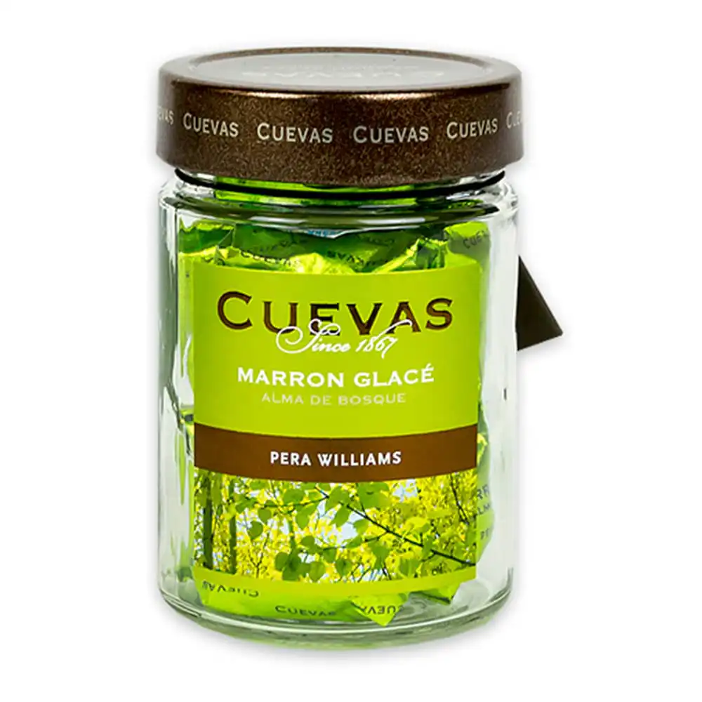 Marron Glace macerat în lichior de pere Williams ambalat individual și în vid. Potriviți pentru persoanele cu boală celiaca. Borcan de sticlă.
